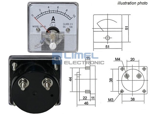Panelový Analógový Ampérmeter 10A, 0 - 10A DC s bočníkom