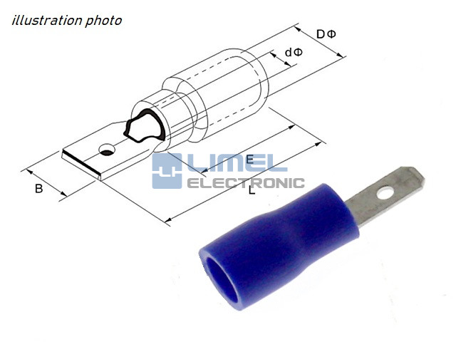 Rozmery (mm): B = 2,8. DØ = 4,3. dØ = 2,3. L = 17,7. E = 10