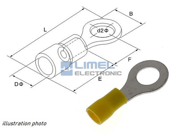 Rozmery (mm): B = 15. F = 13,7. L = 35. E = 13. DØ = 6,7. d2 = 8,5.