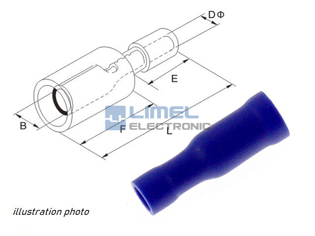 Rozmery (mm): B = 4. DØ = 2,3. E = 10,5. F = 7. L = 23,3