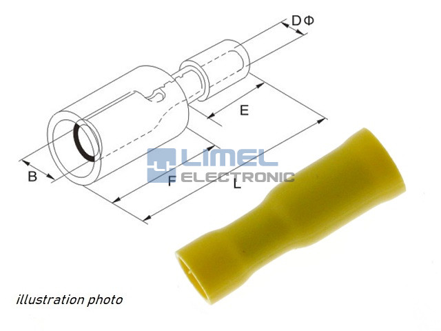 Rozmery (mm): B = 5. DØ = 3,4. E = 12,5. F = 7. L = 25.1